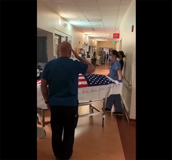 You may have already seen a video that is going around of Alex, along with his coworkers, honoring a veteran who had passed away as the body was moved from the ICU facility. My sister told me that this is a standard practice of honoring our fallen veterans. Many a time she had gotten the email to stand in the hallway along with her coworkers, with her hand over her heart to honor one of our departed service members as their remains passed by them.